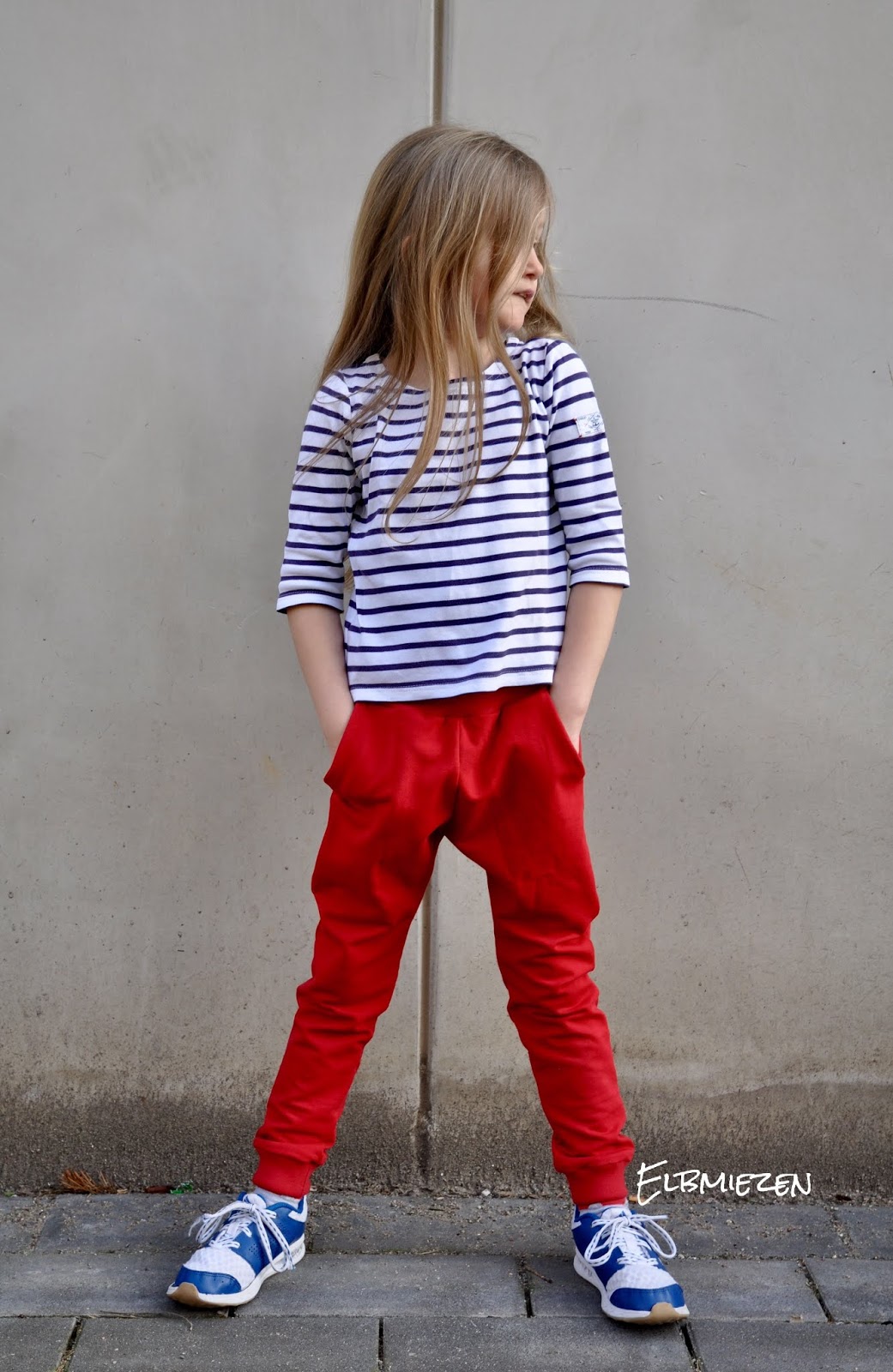 Der Name des neuen Jogginghosen-Schnittmusters von erbsünde, das heute online gegangen ist, ist für meine Miezenkinder also quasi Programm: „Bombom“. Und weil Bonbons oft quietschbunt sind, gab es für die Große passender Weise eine knallrote Hose (Gr. 122/128).